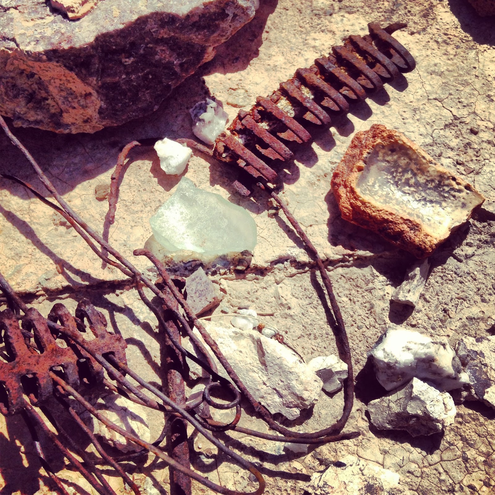 Walking up the gravel slope I checked for turquoise and found to my delight rusted treasures of a bygone era. This place was settled for the sole purpose of mining gold in what was called The Bonanza and Gold Eagle veins discovered in 1888. This location is so remote that there are lots of reminders still intact like vintage desert glass. I picked up beach glass in Washington when visiting my Mom and thought how cool it was to find a piece of glass that is from the turn of the century that nature has had its way with. The edges are soft and the glass is opaque with an opalescent dirty cast. I found tons of it.
