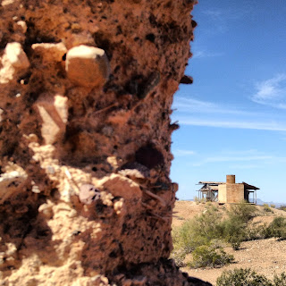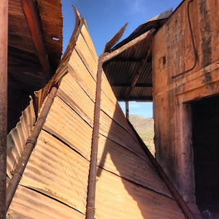 It was a bright and windy morning. This was the day of my second Arizona off road excursion with the Buckeye Rock and Mineral Club. We were headed west of Buckeye about an hour and a half to a turn off the I-10 freeway called Hovatter Road. After driving along the dirt road about 15 minutes, I spotted the building perched up on a hill. This was the gateway to Harquahala Ghost Mining Town. The Native American name is pronounced “Aha qua hala”, which meant “water there is high up.” The intent was to look for turquoise rocks but I naturally headed to the top of the peak to get to know the commanding metal building.